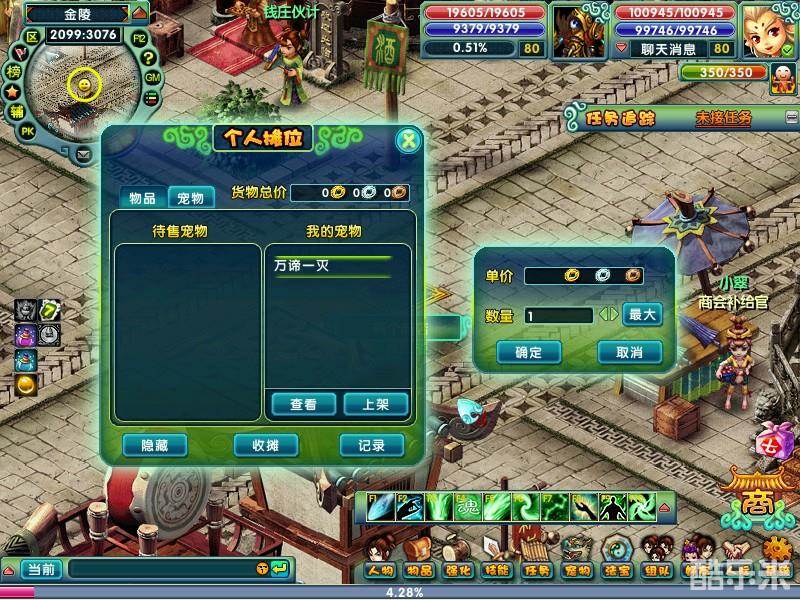 3、右击物品栏中需要出售的物品,会弹出一个定价窗口,输入金额后,即可将物品摆在摊上。摆摊货物总价不可超过10000金。