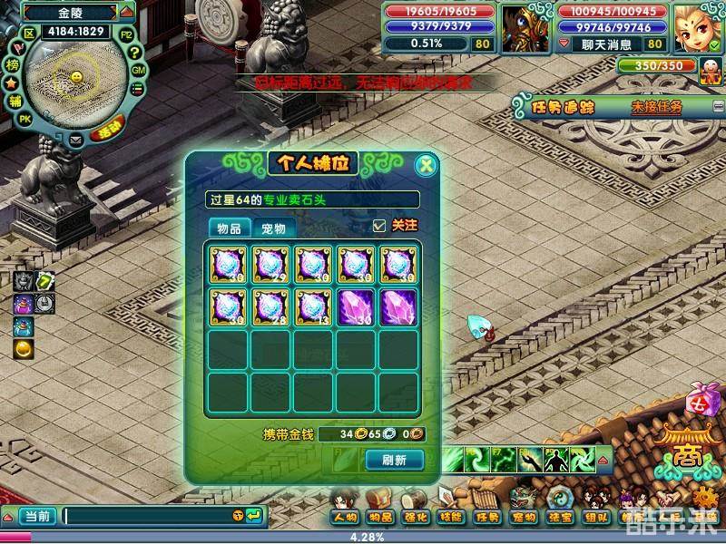 1、目前游戏中只能够在金陵城中摆摊,所以购买物品也只能够到金陵城中寻找玩家的货摊,成功摆摊的玩家外形将会改变为一个货摊外形,我们只要直接点击这个货摊,就能查看到对方摊位中出售的物品。