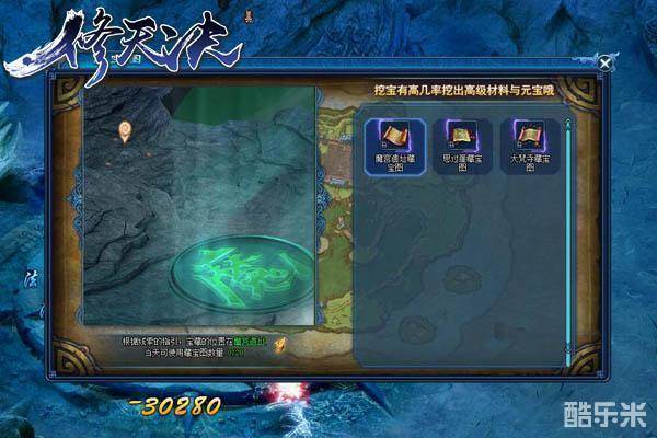 《修天决》中,玩家通过藏宝图挖宝有几率获取各类高级材料与元宝奖励!