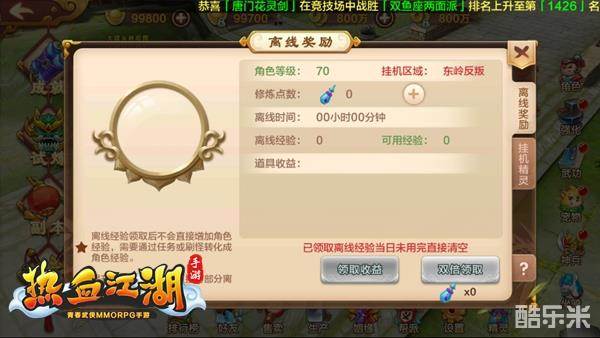 理论上来说在合适的刷怪点挂机可以获得比离线修炼更多的经验,但是不排除刷挂点被抢,人被击杀的情况,不过也不用担心,玩家死后将自动进入离线修炼状态,不会有任何损失。
