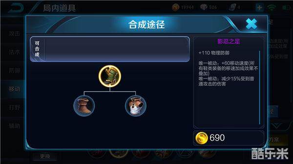 影忍之足:影忍之足由神速之靴及布甲合成,合成后,可为黄忠增加小额物理防御,唯一被动为黄忠增加60点移动速度,还可使其减少敌人攻击黄忠的15%普通攻击伤害,间接性的提高了黄忠的生存能力。