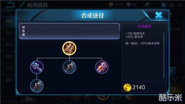 无尽战刃:无尽战刃合成前期同样由铁剑优先合成风暴巨剑,而合成中期的冲能拳套可为黄忠的攻击增加15%的暴击率,提高输出,加上红buff的效果,可提高黄忠攻击敌人时的留人能力;后期,由风暴巨剑、铁剑以及冲能拳套合成无尽战刃,其可为黄忠提高的20%的暴击率,唯一被动还可为黄忠的攻击增加50%的暴击效果,与敌人作战更容易打出暴击,造成巨额伤害,获得人头。而后加上破甲弓与制裁之刃的出装,可对敌人造成不俗的物理伤害,加上灵活的走位,可使我军立于不败之地。