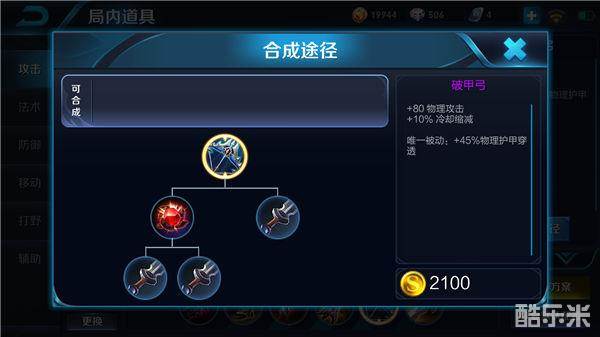破甲弓:破甲弓前期由两把铁剑优先合成陨星,陨星可为黄忠提供10%的冷却缩减,减少黄忠技能刷新时间,其唯一被动-切割使黄忠即便还未完全合成装备,也可为黄忠的攻击提供60点护甲穿透效果,给敌人造成高额物理伤害,降低敌人的物理防御;合成后期由陨星再次与铁剑合成破甲弓,破甲弓其唯一被动将为黄忠提供45%的物理护甲穿透加成。破甲弓出装时间已接近对战后期,而后期所有对战英雄的实力都普遍得到了提升,而尤其需要注意的便是敌方刺客,黄忠作为射手,不论在初期还是后期,都很容易被敌方英雄抓杀,而破甲弓将再次提高黄忠的输出,使得黄忠在后期面对敌方刺客抓杀时,有了一定的自保能力。