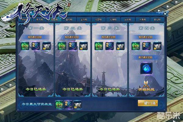 《修天决》中,玩家开启“修天决修炼”并将自身提升至炼体期入门后,即可参与仙界历练玩法。玩家每修炼至一个境界,便可开启四个仙界历练关卡,总共可开启四十个关卡。进入关卡后,玩家需要在规定时间内击杀所有怪物即可通关。当玩家通关仙界历练历练关卡后,第二天便可通过一键扫荡快速获取已通关关卡的各类奖励啦!