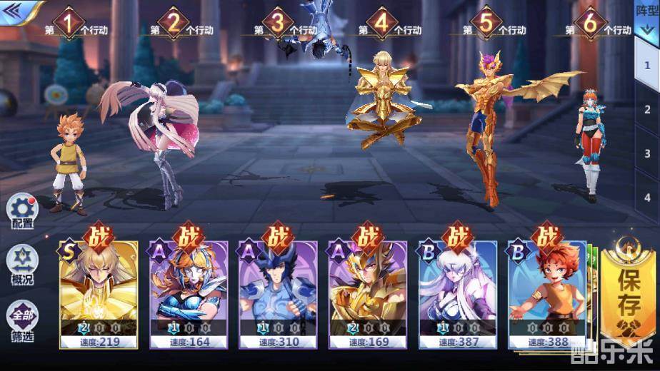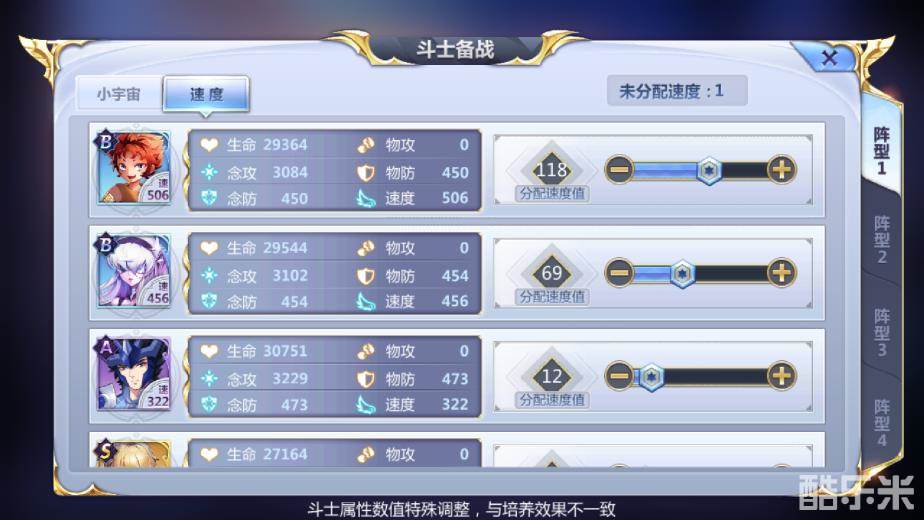 在布阵界面选取出战的圣斗士,然后点击左边的设置按钮对当前阵容进行小宇宙和速度分配设置,共可以设置保存四套不同的出站阵容。