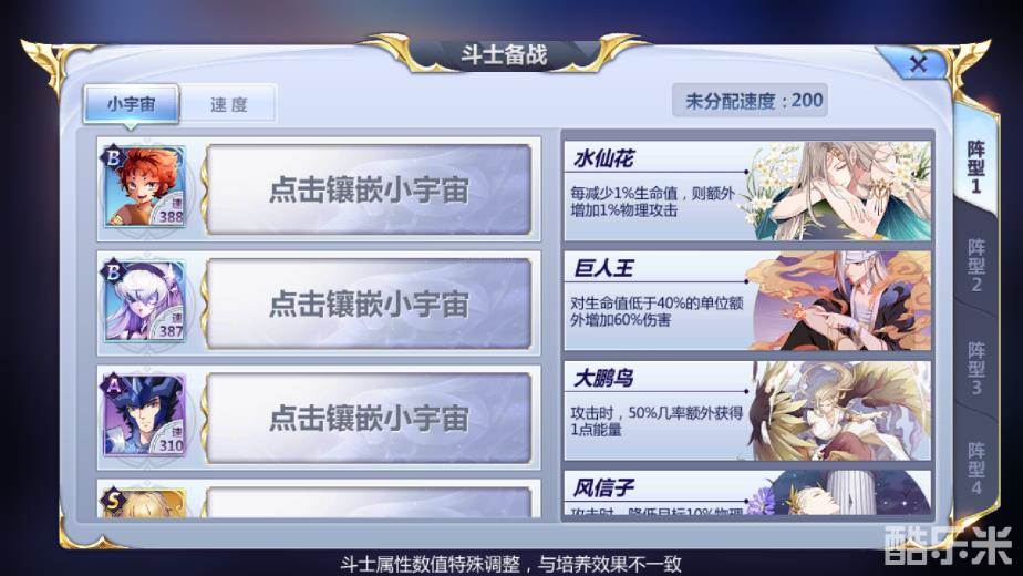 选取阵型,先点击左侧斗士然后在右边选择合适效果的传奇小宇宙,所有传奇小宇宙均可使用;系统提供总和为200点的速度值,玩家可以自由分配给当前阵型的出战斗士,拖动右侧进度条即可进行分配。
