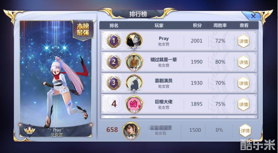 界面左侧可以查看圣地争锋的排行榜,排行榜是根据所有服务器参赛斗士们的积分进行排行。点击排行榜中玩家栏可查看玩家的竞技阵容和段位信息。