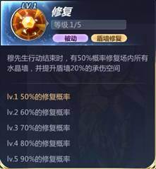 穆先生行动结束时,有50%(60%/70%/80%/90%)概率修复场内穆先生添加的水晶墙,并提升盾墙20%的承伤空间(多人组队时,仅能修复自己队伍中穆先生添加的水晶墙)