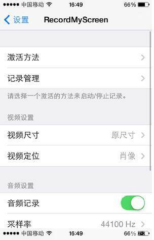 4、汉化好了以后打开iphone手机设置拉到底部可以看到recordmysreen,点击进去设置视频录制方式。我选择的是合拢三指