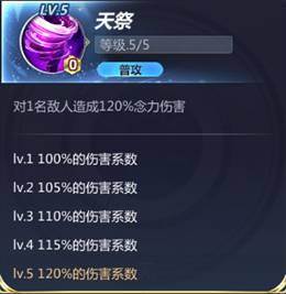 对1名敌人造成100%(105%/110%/115%/120%)的念力伤害。