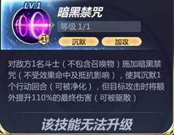 对敌方1名斗士(不包含召唤物)施加暗黑禁咒(不受效果命中及抵抗影响),使其沉默1个行动回合(可被净化),单目标攻击时将额外提升110%的最终伤害(可被驱散)