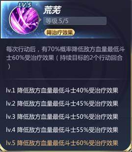 每次行动后,有70%概率降低敌方血量最低斗士40%(45%/50%/55%/60%)受治疗效果(持续目标的2个行动回合)