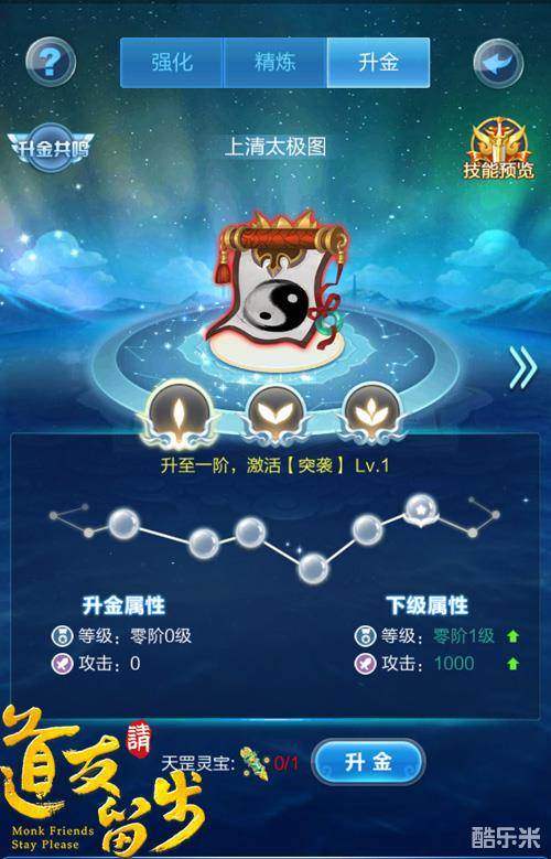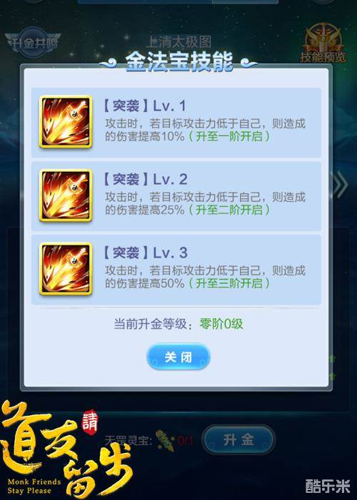 金法宝与红法宝相比,不仅仅在属性上有了飞跃式的提升,同时当金法宝升至一阶时还将额外解锁对应类型的法宝技能。比如说防御型法宝可以获得伤害减免的“守御”技能,而攻击型的法宝则可以获得伤害提高的“突袭”技能。随着法宝的进一步晋升,法宝技能的效果将进一步提高。