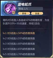 随机对三名敌人造成50%(55%/60%/65%/70%)的物理伤害,为全队提升10%+30点速度,持续一个回合。