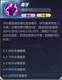 莎尔娜造成伤害时发动毒牙,60%(70%/80%/90%/100%)概率使敌人中毒(中毒效果可叠加五层,其造成的伤害降低6%(10%/14%/17%/20%),持续两个行动回合后消失,若消失前再次中毒,刷新存在时间)。(多人组队时,中毒效果各自队伍独立叠加)