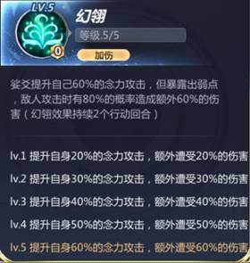 娑爻提升自己20%(30%/40%/50%/60%)的念力攻击,单暴露出弱点,敌人攻击时,有80%概率造成额外20%(30%/40%/50%/60%)的伤害(幻翎效果持续2个行动回合)