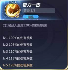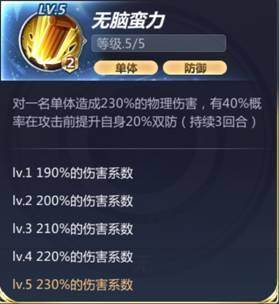 对一名敌方单位造成190%(200%/210%/220%/230%)的物理伤害,有40%概率在攻击前提升自身20%双防(持续3回合)