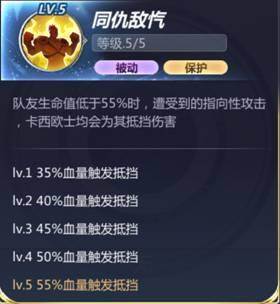 队友生命值低于35%(40%/45%/50%/55%)时,遭受的指向性攻击,卡西欧士均会为其抵挡伤害。