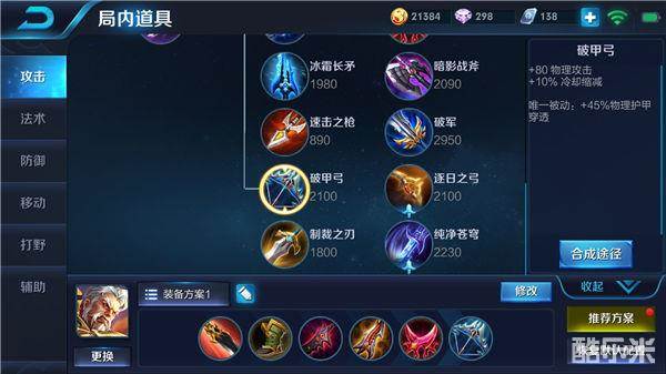 破甲弓:后期坦克英雄都会有高额的物理防御,破甲弓提供物理护甲穿透,显著提升黄忠对敌方前排英雄的输出能力。