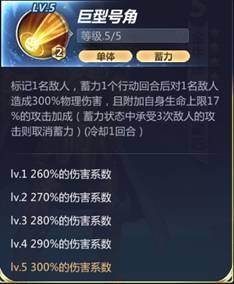 标记1名敌人,蓄力一个行动回合后对一名敌人造成410%(420%/430%/440%/450%)的物理伤害,且附加自身生命上限6%的攻击加成(蓄力状态中承受4次敌人的攻击则取消蓄力)。