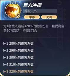 对一名敌人造成280%(290%/300%/310%/320%)的物理伤害,且提高自身50%双防,持续3回合。