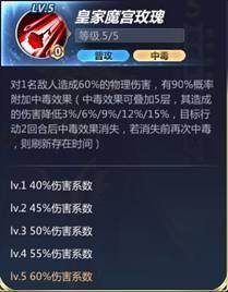 对1名敌人造成40%(45%/50%/55%/60%)的物理伤害。有90%概率附加中毒效果(中毒效果可叠加五层,其造成的伤害降低3%/6%/9%/12%,目标行动2回合后中毒效果消失,若消失前再次中毒,则刷新存在时间)。