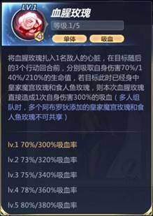将血腥玫瑰扎入一名敌人的心脏,在目标随后的三个行动回合前,分别吸取自身伤害70%/140%/210%(73%/146%/219%、75%/150%/225%、78%/156%/234%、80%/160%/240%)的生命值,若目标此时已经身中皇家魔宫玫瑰和食人鱼玫瑰,则本次血腥玫瑰直接造成一次自身伤害300%(320%/340%/360%/380%)的吸血。