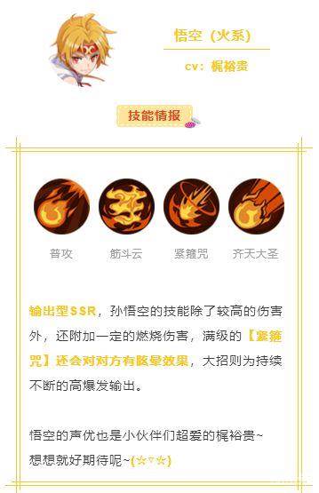 孙悟空是一位输出型SSR,孙悟空的技能除了较高的伤害外,还附加一定的燃烧伤害,满级的【紧箍咒】还会对目标造成眩晕效果,大招则是持续不断的高爆发输出。这样的输出型SSR不来一只吗?