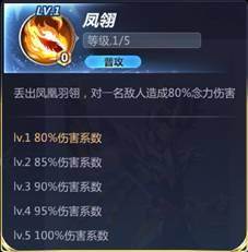 丢出凤凰羽翎,对一名敌人造成80%(85%/90%/95%/100%)念力伤害。