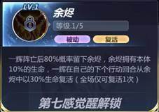 一辉阵亡后有80%(85%/90%/95%/100%)概率留下余烬,余烬拥有本体10%的生命,一辉在自己的下个行动回合从余烬中以30%生命复活。(全场仅可复活1次)
