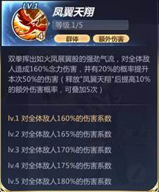双拳挥出如火凤展翼般的强劲气流,对全体敌人造成160%(165%/170%/175%/180%)念力伤害,并有20%的概率提升本次50%的伤害(释放"凤翼天翔"后提高10%的额外伤害概率,可叠加5次)