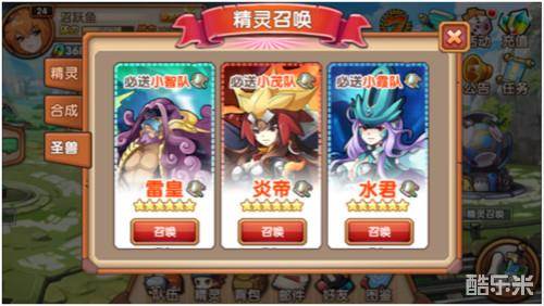 当玩家VIP等级达到7级时,在精灵召唤中将会多出一个圣兽召唤的选项。点击进入之后,里面分别显示有雷皇、炎帝、水君的图像。看来,从这里就是获取这三只圣兽了!每只圣兽的头像上方还分别显示有小智队、小茂队、小霞队,点开查看后,其中分别是由6只不同的紫5星精灵组成的近乎完美的羁绊队伍。