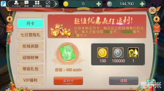 月卡奖励:1属性点,100金币,100000银币