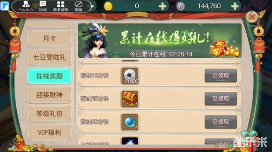5.在线奖励:玩家每天在线5分钟、10分钟、30分钟、60分钟、90分钟、120分钟分别可以领取一次奖励。