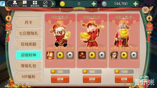 7.迎接财神:财神分为招财使者(初)、招财仙官(中)、招财天尊(高)3个档次。分别需要VIP1、VIP5、VIP10才能引接。引接价格分别为300元宝、800元宝、1500元宝。