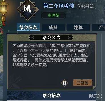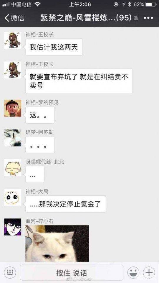 校长在紫禁的帮会是风雪楼相信大家都知道,本次被吧友爆出的是一张风雪楼2帮的截图和一张紫禁之巅风雪楼帮会的微信群截图,王校长说自己估计这两天会宣布弃坑,在纠结卖不卖号。