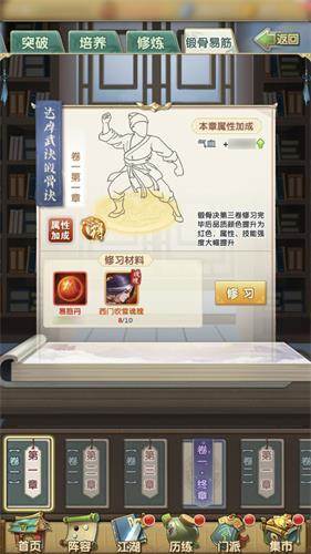 正如两本秘籍所言,缎骨易筋玩法分为《锻骨决》与《易筋经》两部分。其中,《锻骨决》修炼部分为橙色弟子独有,《易筋经》则为部分已升红的橙色弟子、红色弟子以及红色掌门所拥有。《锻骨决》共3卷,每一卷分4章,弟子消耗道具即可修习一个章节,修习后获得属性加成,同时开启下一章节。修习完所有《锻骨决》后,弟子品质就可提升至红色,增加心得效果,即所有弟子都将拥有技能增伤效果哦;另外李寻欢、西门吹雪等优秀弟子还将额外有真气技、合璧技能变化等效果。《易筋经》一共有5卷,每一卷分为8章。同样需要消耗道具即可修习章节,修习后获得属性加成。修习完一卷的所有章节,可以增加心得效果哦,且每一卷的效果可叠加累计呢。