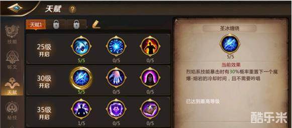 第二层天赋推荐选择加满圣冰缠绕。圣冰缠绕是法师的核心天赋,每当烈焰技能暴击时就有30%概率刷新魔爆-熔岩,并且技能无需吟唱。如果法师暴击够高脸够白甚至能做到无限瞬发大火球,无论是在PVE还是PVP中瞬发的大火球都是让敌人感到忌惮的存在。