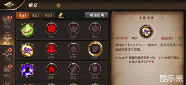 暗袭:大幅提升伤害效果,对血量较低的敌人造成双倍伤害,非常强势的输出铭文,暗牧必备。