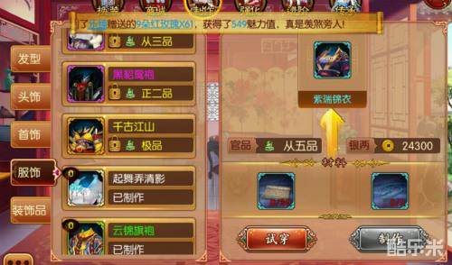 然而怎么才能得到这件衣服呢,光看并没有什么卵用啊,还是要靠勤劳的双手来获得啦!即使小主不是VIP,没有人民币,我们也不用虚,正所谓天道酬勤,一起动手制作吧!贴心的小编又是时候送助攻啦!小主可以从主界面的时装功能进入后,点击时装免费制作自己心仪的时装,而且提供试穿功能。进入时装制作后,有些时装还处在未解锁的状态,小主们需要有相应的官品才能制作时装,制作时装会消耗相关材料。所以小主们在偌大的后宫不要偷懒哦,否则尔虞我诈、勾心斗角,小主升上官品就会难上加难,没有官品,就没有衣服,简直就是恶性循环,所以进击吧小主们!