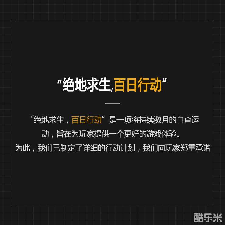 这次官方发起的“百日行动”,将自查众多玩家关注的《绝地求生》问题,服务器、客户端、反外挂、玩家匹配、BUG修复及游戏品质提升。