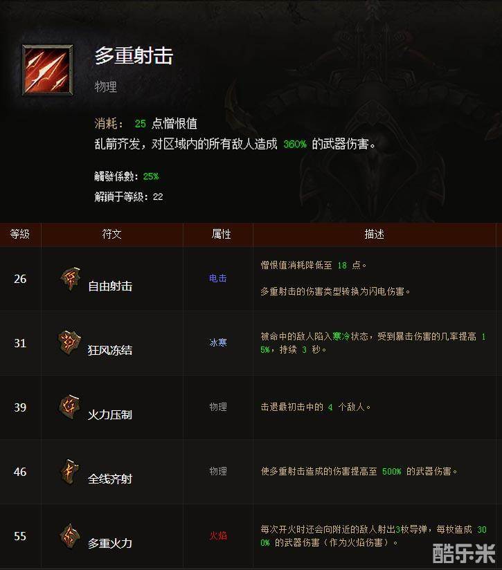 1、多重射击的基础攻击为360%武器伤害,消耗25憎恨;