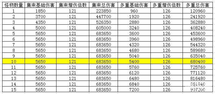 群体伤害:不洁多重能打到10个怪以上总伤害就能赶上掠夺集束;打到15个怪总伤害就大大超过了集束!