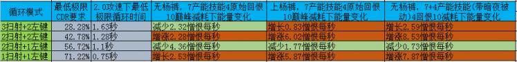 此表中以正常熟练玩家的操作参考扫射打断后的能耗,给出持续完美循环中理想的能量每秒变动理论情况。