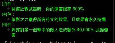 暗影套是目前PTR比较有特色的套装(让DH拿了近战武器),一切需要弓的技能,皆不能使用。所以这套装备强化了所有近战武器能释放的技能,比如刺穿,造就了一个具有高额单体伤害的套路。