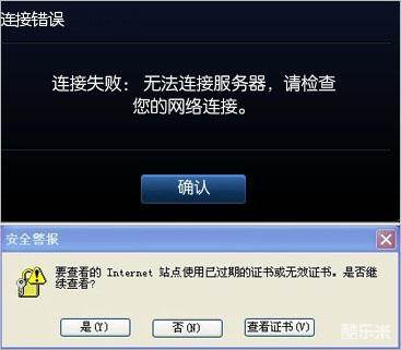 若您在英雄联盟登录大厅时,提示“连接失败:无法连接服 务器,请检查您的网络连接。”,并弹出安全警报窗口,提示证书过期或无效,如下图: