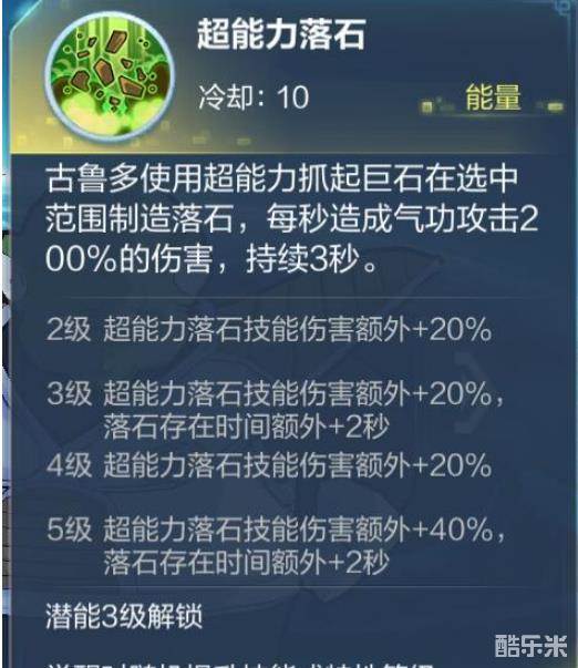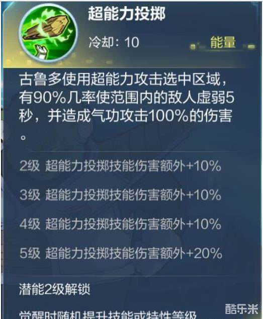 超能力控制是古鲁多在动漫中的超能力设定之一,在游戏中该项设定演化为了两个技能,分别是超能力投掷和超能力落石。超能力投掷除了能造成100%的气功伤害外,还能造成范围内角色90%的几率虚弱5秒。超能力投掷可以造成范围内200%气功伤害并持续3秒,一个群控+一个群伤技能在团队乱战中必定发挥很大的作用。