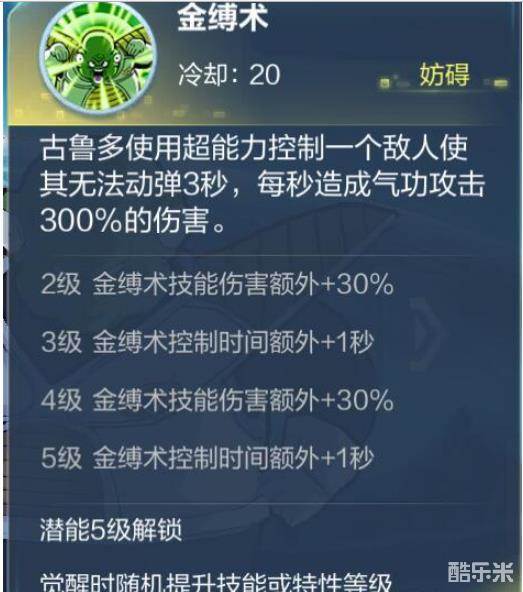 金缚术是动漫中古鲁多的看家本领之一,在游戏中也得到了完美体现。属于单体控制技能,可以束缚一个敌人3秒并造成每秒300%的气功伤害,这个绝对是对方DPS的梦魇,一旦被控制将使得对方处于完全被动境地。
