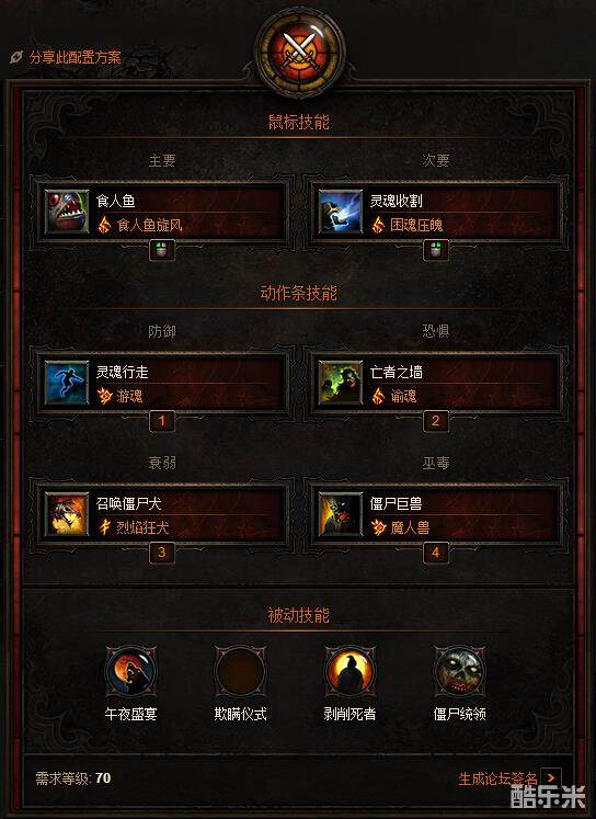 主动里面前4个必带。僵尸墙的选择上,冰墙减伤减速,在75+火墙开始不给力时用冰墙辅助无疑更好。食人鱼旋风用来聚怪(注意狗和僵尸都有不俗的AOE伤害)和提供A类增伤,因为这套build A类增伤几乎只有狱牙套的20%. (装备上的+狗伤害,+僵尸伤害是独立增伤),这也是选择穿透迷雾被动的原因。