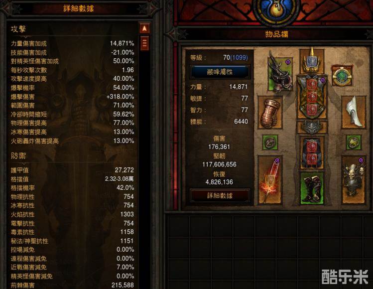 3.伤害方面嘲讽流单人伤害能过3700E,物理伤流派(更科学)大约在4500E左右(以上数据时全身均未强化,且无地狱火项链,另后一个数字是推算了,有点记不清了。仅听说,比我伤害高的大有人在,至今没搞懂差在哪里),组队配合核眼,各种增伤轻易到万亿附近,而且是十下,赶上被动就是二十下。暴击率大约为50%上下,理想化可以达到64%暴击,配合辅助dh可以达到84%暴击。暴伤方面卤煮自认为已经很高了。身上装备97.40.34.47。